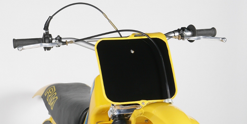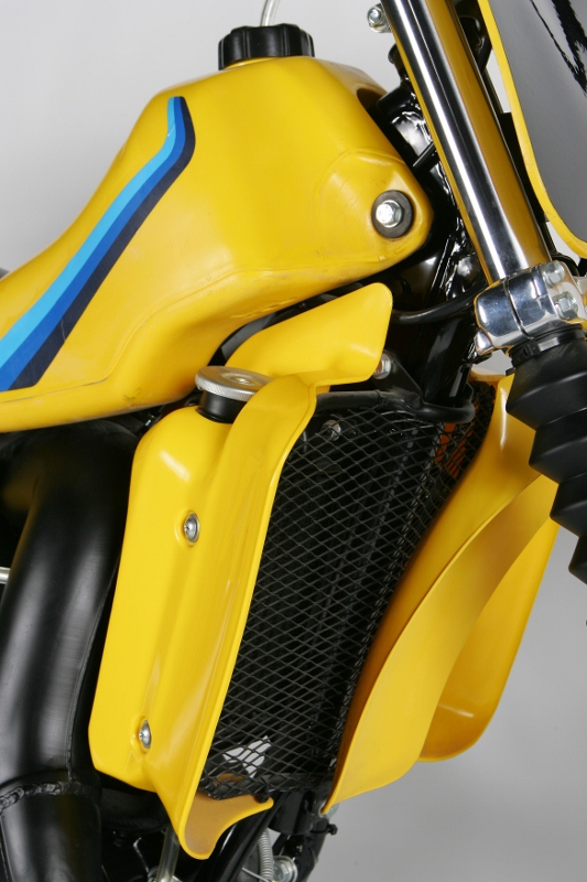 In 1982, all the manufacturers had very different ideas as to the best placement of the radiators for their liquid-cooling systems. Yamaha chose to mount theirs on the steering head, while Honda bolted their twin radiators in front of the gas tank. On the KX, Kawasaki decided to bolt one long radiator asymmetrically on the left side of the tank. For the RM, Suzuki hung one extra-large radiator in front of the frame, down low, below the tank (very similar to the 1997 Honda CR250R). The RM’s design offered both the lowest center of gravity and the largest cooling capacity. Photo Credit: Stephan LeGrand