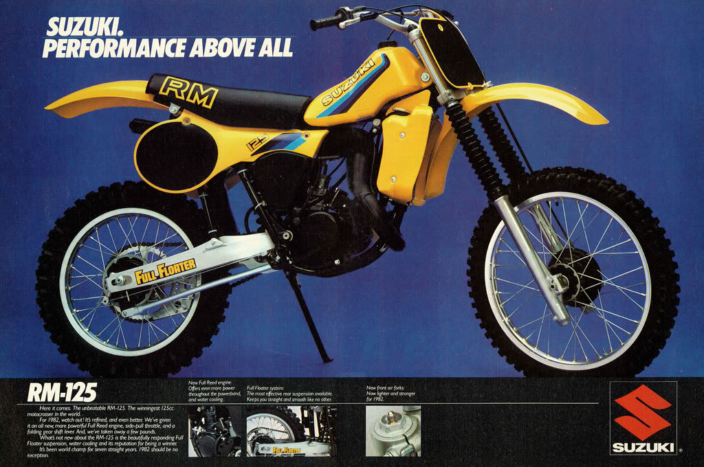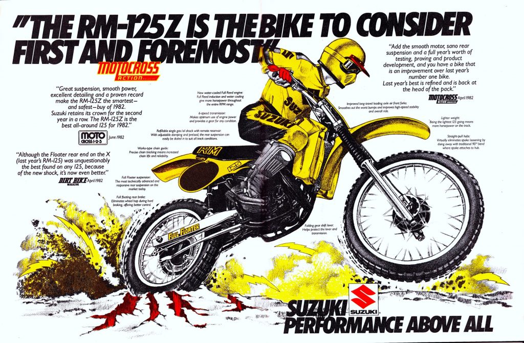 At first glance, the ’82 RM125-Z appeared to be merely an ’81 RM125-X with Bold New Graphics. Under the skin, however, Suzuki made many refinements, both small and large that added up to a very different motorcycle. Photo Credit: Suzuki