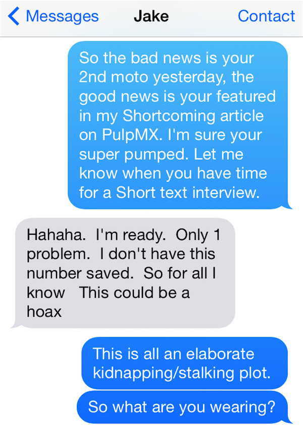 I’m not superstitious, but Jake Weimer must have broken a mirror, while walking under a ladder, and stepping on a black cat… or however that saying goes, because he has had a string of bad luck. I’m not sure who has lower self-esteem, Weimer or Filthy Phil, but I almost feel guilty finding their self-loathing so humorous. Intentional or not, I find Weimer’s interviews funny; he’s always down on himself and quick to find the negatives in his riding. It will be interesting to see who picks up Weimer for next season. He is too good to not get a ride, and unlike when the music stopped and Metcalfe was left without a home, there are enough open rides this off season that he will surely get picked up…..right? I got in touch with Weimer to see how his comeback to racing went after getting hit by Mookie Fever.