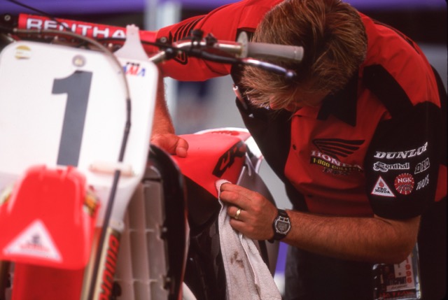 Coombs: Skip would deserve a great deal of credit for how he managed it, too. Skip sort of became the superstar mechanic. He had an Oakley deal and a Mechanix Wear gloves deal. He was in ads and we always interviewed him on TV. Back when you could actually hear an interview on TV in the pit row. They all did a good job of keeping Jeremy the same person he was when he won Anaheim the first time back in 1993.