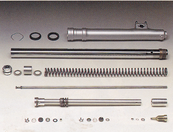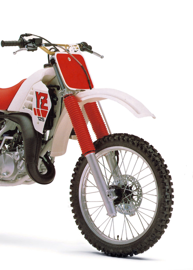By far the biggest improvement made to the performance of the 1988 YZ line was the adoption of Kayaba’s new 43mm cartridge fork. The cartridge design allowed a wider range of adjustment, less oil aeration and far smoother performance than the conventional damper-rod forks it replaced. Photo Credit: Yamaha |