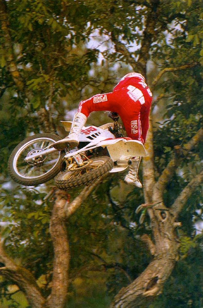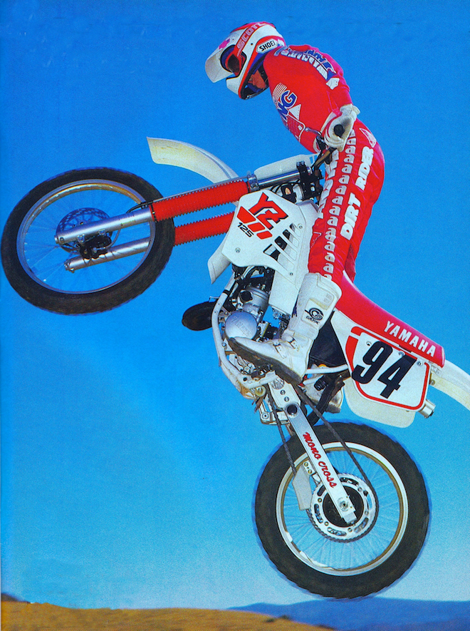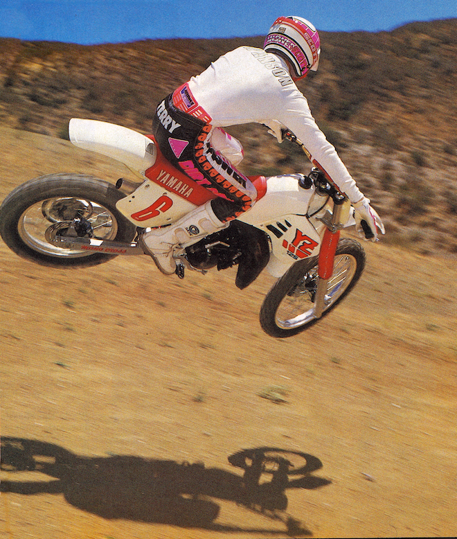 With its punchy motor, light weight and slim ergonomics, the YZ was a capable flyer. Yamaha ace Doug Dubach demonstrates the YZ’s flickability in 1988. |