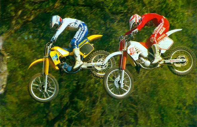 In 1988, the Suzuki and Yamaha were at opposite ends of the powerband spectrum. The RM was a top-end only screamer and the YZ was a low-to-mid torquer. Photo Credit: Moto Revue |