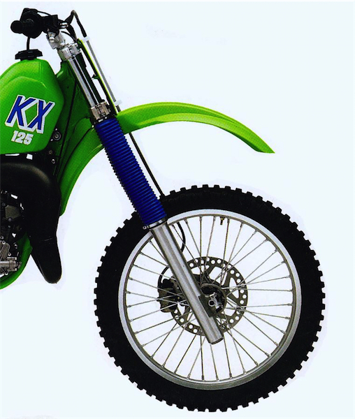 Originally, all full-sized ’89 KX’s were supposed to come equipped with Kayaba’s spiffy new 41mm inverted cartridge forks. At the last minute, however, Kawasaki USA pulled the plug on that idea and switched to 46mm conventional KYB’s for the US market. This was done in part due to the input of US test riders, who preferred the old-school design and in part to undercut the price of the new Hondas, which had received a major price bump for ’89. |