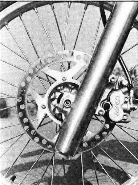 For 1989, Kawasaki upgraded the KX’s front brake from a single, to a dual-piston binder. Even though all four Japanese manufactures used Nissin as the supplier of their brakes, each brand offered unique performance. Even with the switch to the dual piston caliper, the KX could not match Honda’s combination of outright power and braking feel. |