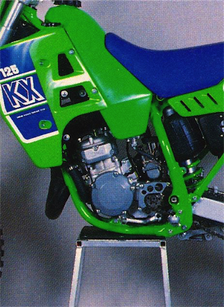 With the 1988 KX125 being all-new, Kawasaki looked more toward refinement, than redesign for 1989. A new larger fork graced the front end and a steering angle change pulled things in a half a degree from 27 to 26.5 degrees. In the motor, the engineers modified the KIPS (Kawasaki Integrated Power-valve System), enlarged the ports and lowered the compression in an attempt to extract more ponies. While the ‘88’s bulky and unattractive plastic remained, a new seat improved comfort and a switch to dual pistons for the front brake promised improved pucker power.
