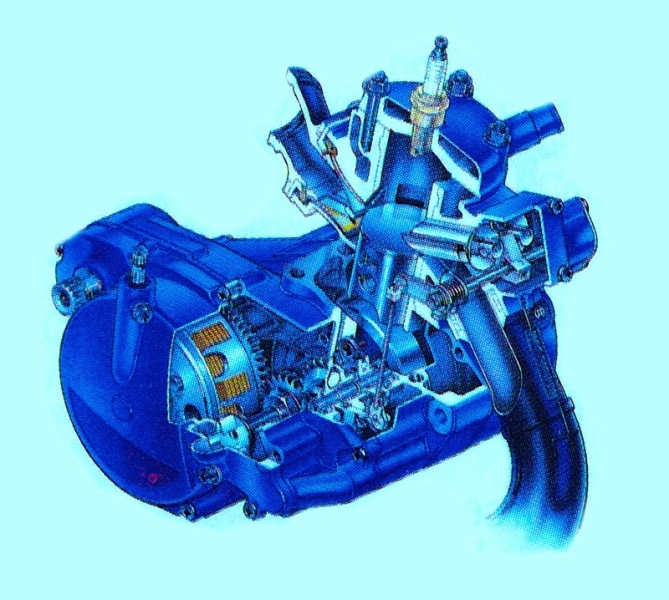 In 1987, Suzuki spec’d an all new 246cc mill for the RM250. The new motor featured Suzuki’s first usage of a true “power valve” (previous RM’s had used an ATAC style exhaust resonance chamber) to widen the power curve. The new AETC (Automatic Exhaust Timing Control) system used a set of sliding guillotine valve to raise and lower the exhaust port height based on engine RPM. In 1989, Suzuki retire this motor in favor of an all-new case-reed design. |