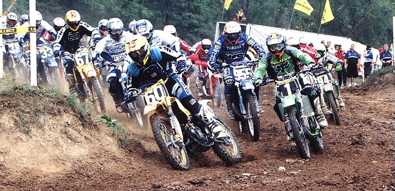 “This photo looks like it is from Steel City in 1999. I pulled the holeshot in this moto and the only guy that passed me was, guess who… one Richard Carmichael Jr.who was on a bit of a hot streak. That streak of his would last for the next seven years. Anyway, this was a good race for me. I was riding for the Primal Impulse/Suzuki team and our bikes were amazing that year. I honestly think our bikes were as good or better than anything else out there that year. I won the Minneapolis supercross that season and Michael Brandes and Brandon Jesseman also had some good rides that year. The other guys visible in this shot behind me and Ricky are Casey Johnson, Brock Sellards, Stephane Roncada, Danny Smith, Brandon Jesseman, Casey Lytle and the 955 is Euro rider Carl Nunn.