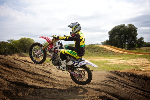 | The Bomber attacks! 3-time 125 national champion and supercross champion Mark Barnett, there to work on the track for Reed, took time to saddle up and test out his creation. He’s on Reedy’s ’08 CRF450 and yes, he still rides pretty good. |