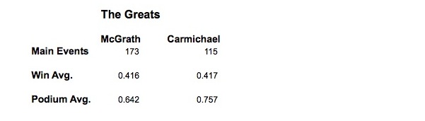 – Looking at James win average at this point in time (.506), if he ever wants to beat McGrath’s total win count he will theoretically need to compete in about 56 more main events. That’s the rest of this season and about three more.