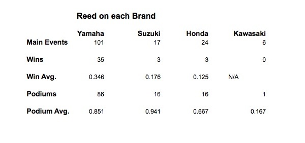 Although Reed has never looked better since he has gotten onto a Honda, the stats still show he had the most success while on a Yamaha. It is a little deceiving because he had so many more main events on the Yamaha compared to the Honda and it’s interesting to see how similar his averages are on a Suzuki compared to the Honda.