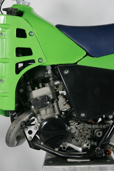 Here you can see a prototype version of Kawasaki’s “KIPS” variable exhaust port on the side of the SR’s cylinder. Before the production rule came into effect in ’86, the manufactures could test out pre production stuff like this on their factory race bikes. The “Kawasaki Integrated Power-valve System” would make its debut the next year on Kawasaki’s ’85 KX models. Photo Credit: Stephan LaGrand