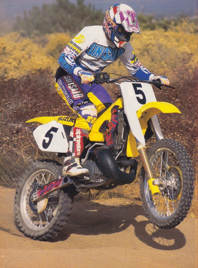The Man: Roger DeCoster (here riding the new RM for Dirt Bike magazine) played a major role in the development of the new RM. One of Honda’s most valuable assets in the eighties, Suzuki hoped to repeat that magic on yellow in the nineties. Photo Credit: Dirt Bike