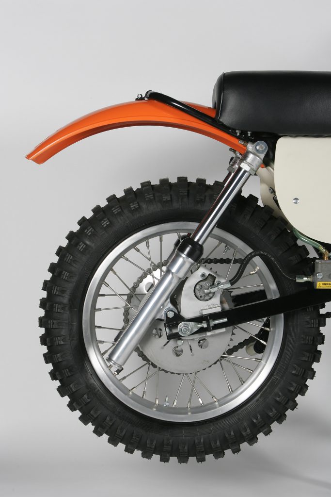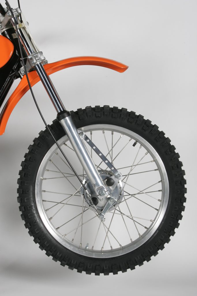 The front end of the MX-250 was less interesting than the bizarre rear arrangement. Up front, the MX-250 used a set of off-the-shelf Showa forks. The front wheel was a stock Yamaha front hub mated to Sun rims and Buchanan spokes. Suspension performance was considered good for the time.