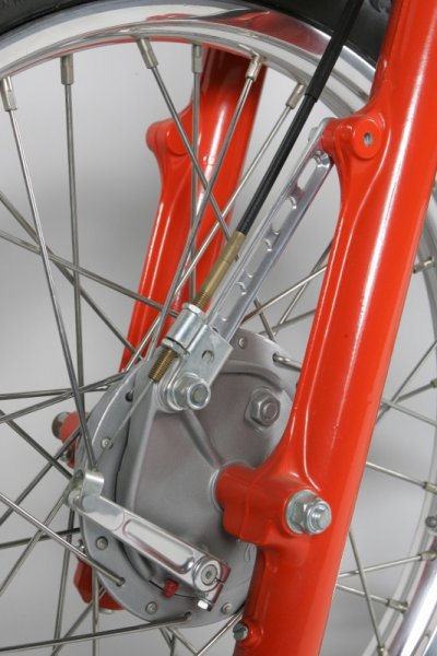 | The KTM still used an old-school single action front drum on the 495. It works decently but was not as powerful as the dual-leading shoe brakes on the Honda and Yamaha. Photo Credit: Stephan LeGrand |