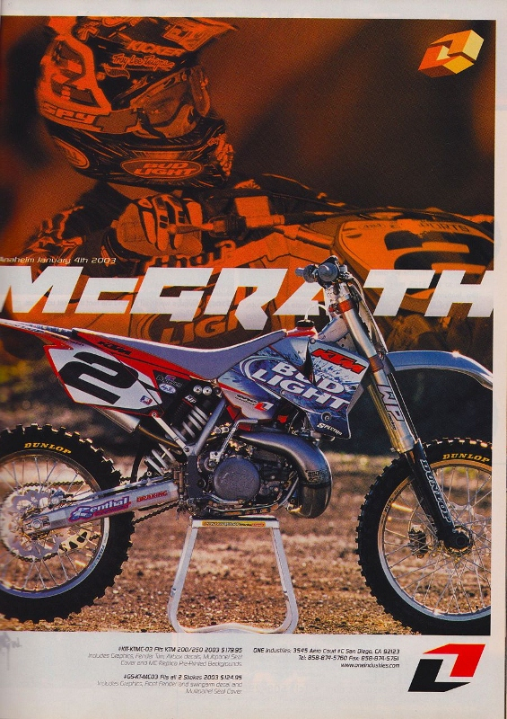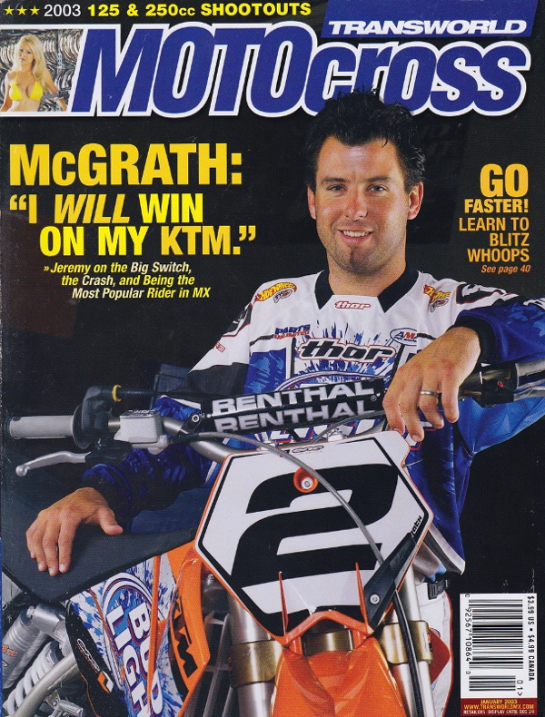 | KTM made a lot of promises to Jeremy McGrath before he signed with the team for 2003. They were supposed to deliver an all-new linkage-equipped works bike for him to race and that would improve the Austrian bike’s notoriously wayward handling. As it turned out, the promised bike never materialized, and MC was never able to back up his Transworld cover boast. |