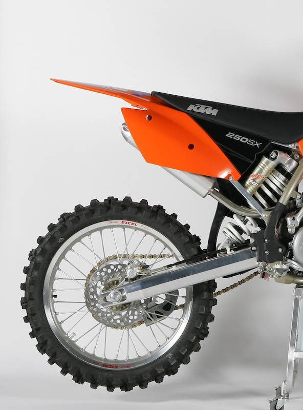 In 2003, it was the chassis that really let the 250SX down. At the time,.European machines were typically tuned more for the faster tracks found on the Grand Prix circuit. As a result, cornering usually took a back seat to high-speed stability. For ’03 KTM totally revamped the 250SX’s chassis in hopes of better appealing to the American consumers. They steepened the head angle a half-degree, lengthened the swingarm 10mm and changed the fork offset all in the pursuit of sharper turning. To say the result of all this tinkering was not a success would be quite an understatement.