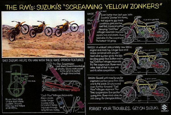 The ’78 RM-C models saw the last of the alloy tanks (at least for 30 years, until the current RMZ brought them back). The ’78 ½ RM-C2 would usher in the era of the plastic tank. Although less prone to dents, the plastic tanks guaranteed your decals to peel off after the first ride. That combined with their generally ugly shape makes them far less appealing to me than these cool mid-seventies designs. |