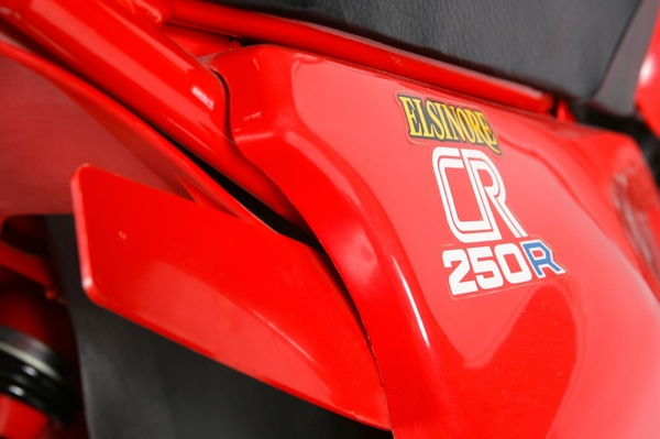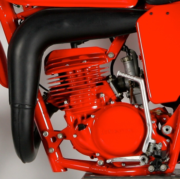 The ’78 CR250R Elsinore was an all-new design from the ground up. It featured a new frame, motor, and bodywork to go with its remarkable suspension. The heart of the new CR was its 247cc air-cooled two-stroke single. The Red Rocket’s motor was works inspired just like the rest of the machine. It featured a unique internal design with two auxiliary scavenging ports that simulated a case-reed intake and allowed a fully skirted piston to be used for durability. The intake itself used a six-pedal reed-valve, fed by a 36mm Keihin round-slide carburetor. The cylinder featured a chrome bore (non-borable), which dissipated heat better than the traditional iron liner. It was also was lighter and allowed Honda to use smaller fins on the cylinder. The rest of the motor was very compact, with cases tightly formed to the mechanical internals and no wasted space. Components like the as the shifter and kickstarter were made of lightweight aluminum instead of the more common steel to further trim weigh. All told, the new motor came in at a remarkable 56 pounds.