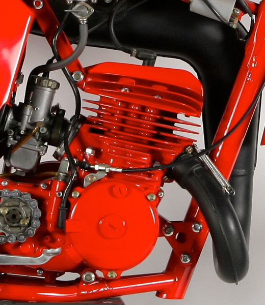 | The heart of the Red Rocket was its advanced 247cc powerplant. Borrowing heavily from the RC Type II works racers, the new CR motor was all business, right down to its GP inspired left-hand kick and ultra-compact dimensions. Using a works-style cylinder and six-pedal reed-valve induction, the CR produced a hard-hitting pro-oriented style of power. Soft off the line, the CR really hit its stride in the mid-range, where it pulled with ferocity into a screaming top-end blast. Too much for most novices, the Elsinore was fast enough to outrun most other brand’s modified machines. Photo Credit: Stephan LeGrand |