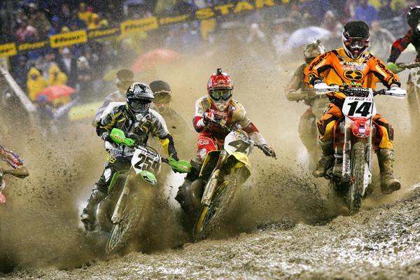 | The 2005 Anaheim season opener was billed as the âPerfect Stormâ. At least they got the storm part right. The colossal quagmire would claim many a victim this night, including the defending series champ who would struggle to finish. Photo courtesy of Racer X |
