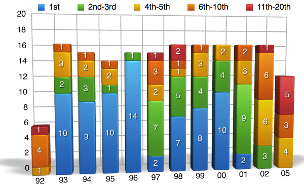 Now maybe Jeff Ward doesn’t have the best percentages and maybe he wasn’t the guy who blew the doors off everyone else back in the day, but Ward was a gamer and he was willing to do whatever it took to get the job done. While most of the guys around him were doing the whole, “win a few races then crash out, win a few races then crash out,” Wardy would just podium his way into title contention and most of the time it worked. He’s not on this list for nothing though and as you can see from the charts below Jeff still knew how to win races on a regular basis. Another thing you have to keep in mind when thinking about Ward is that by ’91 the guy was 30 years old and still winning races! In a time where some of the top guys were hanging it up in the 25-27 range, that’s an amazing statistic.