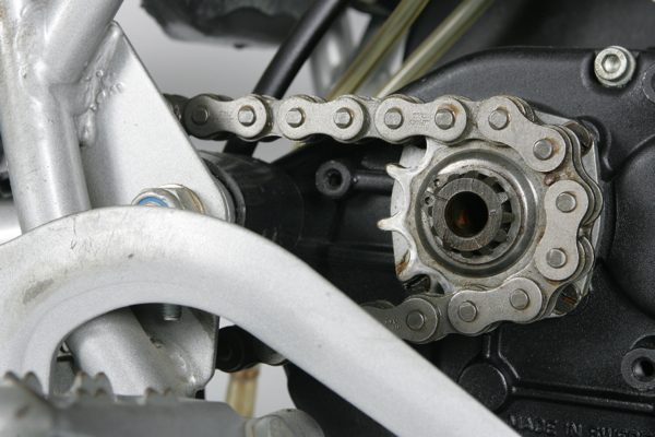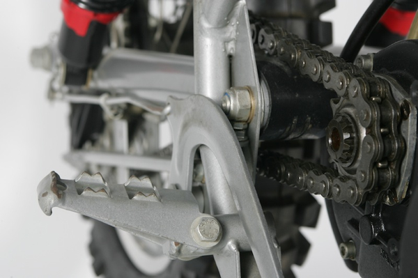 One of the innovations made to MX machines toward the later part of the seventies, was the repositioning of the countershaft sprocket. Early long-travel machines had suffered issues maintaining the proper chain tension throughout the full range of their movement, leading to potential failures. As the manufacturers got more experience with the new technology, they found that moving the countershaft very close to the rear suspension pivot point, solved most of these issues. |