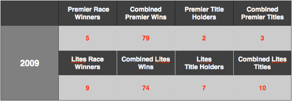 • 2009 is tied with the two previous years for having the the least amount of premier class race winners in the past decade with 5.
