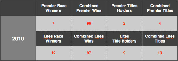 • 2010 is tied with three other seasons (2006, 2012, 2013) for having the most amount of lites main events winners with 12.