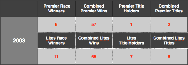 • Out of the twenty riders on the line at the opener in ’03, only four of them had won races in both the lites class and the premier class.