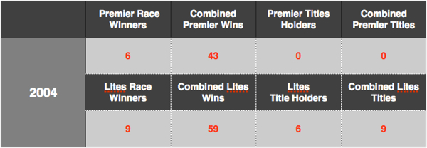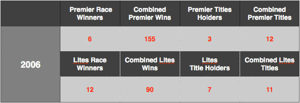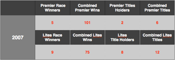 • Out of the 8 lites champions in 2007, only four of them had ever won a premier class main event before.