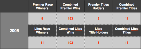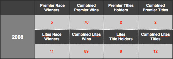 • ’08 is also one of only four seasons in the last decade where there were more lites wins than premier class wins.