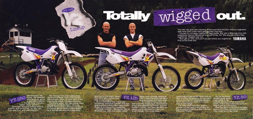 Blaze- In tenth, I have an ad that I think was actually pretty interesting, but fell victim to events out of its control. When Yamaha shot this inventive ad for their 1994 YZ lineup, I doubt the big wigs at corporate had any idea that their star rider was about to go completely off the reservation and walk away from a multi-million dollar contract. Damon had struggled some after coming back from ACL surgery, but he had still won a few victories in ’93. It was certainly not the season he or Yamaha had wanted, but at least on the outside, it did not seem like a disaster. From Bradshaw’s perspective, however, the fun had gone out of racing. He was burned out and ready to call it quits at the ripe old age of 21.
