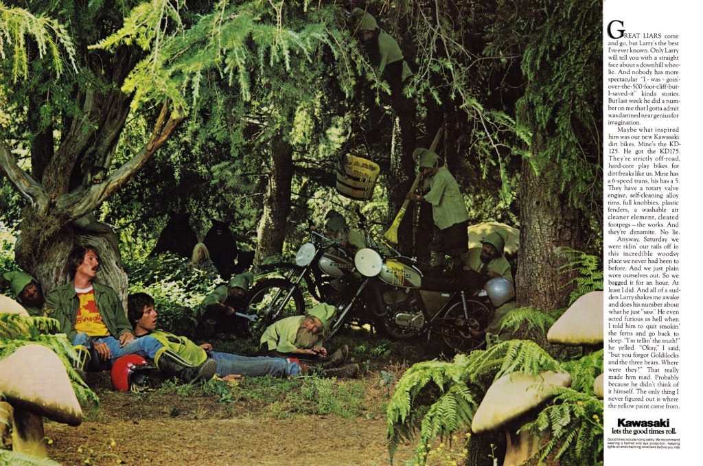 Matthes- So high on the creepy scale it’s not even funny. And why are two “buddies” laying there with ones head almost in his other “buddies” lap? There’s some weird shit going out in Kawasaki’s forests around its Irvine, CA headqurters man.Blaze- In second, we have an ad that most of you reading this have probably never seen before. This ad for the 1976 Kawasaki KD125 and KD175 is a complete acid trip from start to finish. It tells the story of two guys out on a ride that find themselves set upon by a set of wood gnomes when they stop to take a break. Seriously, that’s the pitch. Apparently, the gnomes enjoy knocking out stray motorcycle riders and painting their bikes yellow (Any bets on the number of joints consumed coming up with this advertising gold?). This has to be the single oddest motorcycle ad ever produced. Call me crazy, but I doubt this thing sold Kawasaki many motorcycles in ‘76. Ah, the 70’s….