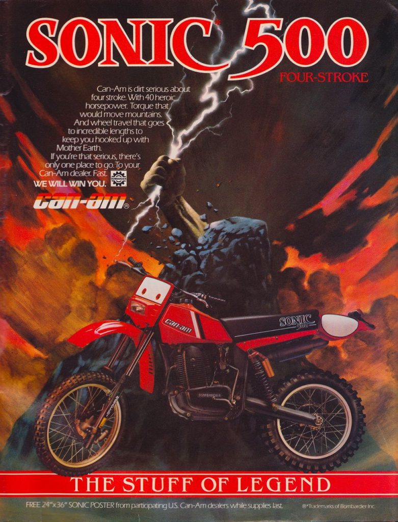 For starters, this has to be one of the ugliest bikes I have ever seen. That rear fender is just abysmal looking and I’m not sure there is an attractive line on the machine. Then you have the whole fire and brimstone motif that is not doing the bike’s looks any favors. If you look up fugly in the dictionary, there is a picture of a Can-Am Sonic 500 front and center. Then you have that tag line, “The Stuff Of Legend”, really? Hyperbole much?Blaze- By 1982, Can-Am was on the ropes and reeling. They had enjoyed a great deal of success in the early 70’s, but by the time this ad came out they were struggling for their survival. Unfortunately for Can-Am, this POS was not about to turn the tide.