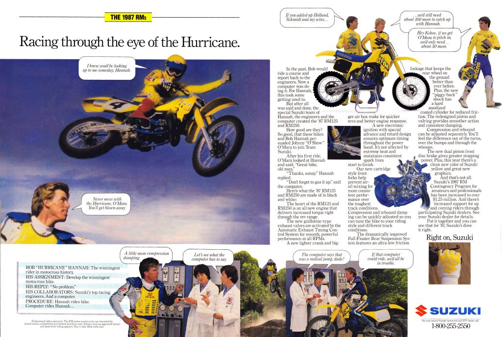 Blaze- In the world of motocross, few ads have lived on in infamy like this one for the 1987 Suzuki RM’s. This was supposed to be the ad proclaiming the arrival of Suzuki’s new savior, ’84 Supercross champ Johnny “O’Show” O’Mara. Instead, it became known as the ridiculous “computer” ad. The idea was simple: show how advanced the new RM’s were by partnering the old man of motocross, Bob Hannah, with some computer that looked to have been stolen from the set of the original Star Trek. The problem was, they paired this reasonable concept with some of the most ridiculous dialog this side of Winners Take All.
