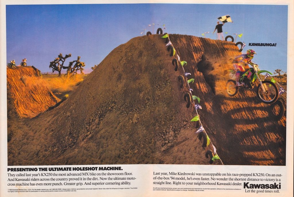 Matthes- Yeah, out of all the motocrossers back then that I could picture NOT yelling “Cowabunga”, Mike Keidrowski would be at the top of the list. On the list of mx’ers who I COULD imagine yelling “Cowabunga” would be Mike Craig.Blaze- As I stated in my list of good motorcycle ads, there is a very fine line between cool and crap. To me, the ’93 Kawasaki KX250 ad nailed the former, while its ’94 successor pegged the latter. Chicken busting out a mega leap? Badass. Mike Kiedrowski punching holes in dirt mounds while yelling the moto of the Teenage Mutant Ninja Turtles? Mega lame. You have a guy would obliterated the competition all summer, on an all-new sweet looking machine (one of my all-time favorites) and this is the best you can come up with? Pathetic.