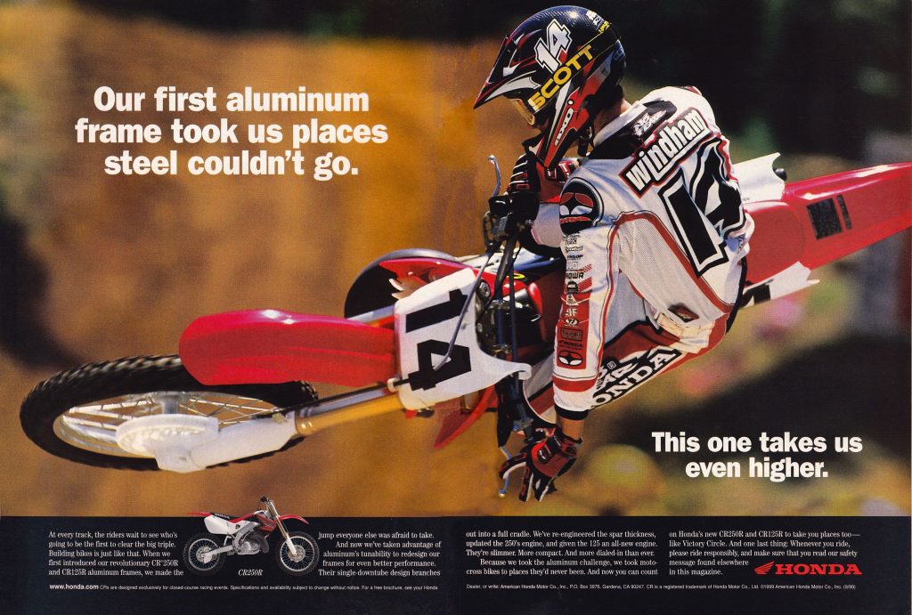 If you either have not caught it by now, the Where’s Waldo in this ad is the small motorcycle at the bottom left. Somewhere along the way, someone mixed up the pictures of the all-new and much improved 2000 CR250R, with the outgoing and unloved ’99 model. This rather significant oversight made it all the way to the printers and into the hands of MXA readers everywhere. Considering the number of people that must have looked over this ad before it went to print, it is remarkable these ever made the light of day.Blaze- This 2000 Honda CR250R ad is a case of a perfectly good concept sabotaged by poor execution. To the casual observer, in fact, there may not appear to be anything wrong. Look a little closer, however, and you will see that something is amiss. You surely can’t fault the flawless style and classic grace of a young Kevin Windham. He is doing his part and whipping the all-new CR into submission for the cameras. In this case, the fault appears to have been with the proofreaders, who apparently did not get the memo about this being an ad for the 2000 CR line.