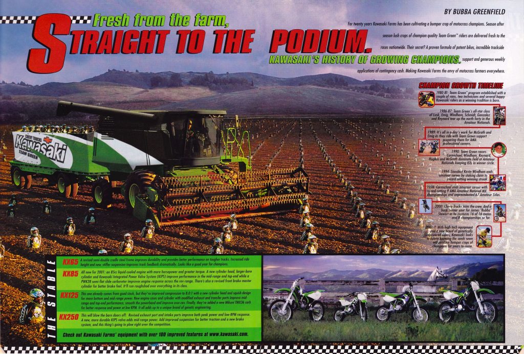 Blazier: If I’m going to bash Yamaha for being boring with their 2013 YZ ad, I probably should at least give Kawasaki some credit for attempting something different with this 2001 piece. In a sea of cookie-cutter ads, this baby certainly stands out. Unfortunately, it is more than just unique, it is downright odd. While I get the whole “harvesting young talent” metaphor they were going for, it just gives me the creeps. For some reason, the thought of chewing up young kids buried to their waist in dirt with a giant set of blades just does not make me want to buy a motorcycle (I know, call me crazy). In truth, this ad makes me think of some cheesy 50’s sci-fi B movie, Invasion of the Team Green Snatcher’s or something like that. Kawasaki is people…its PEOPLE…!!!