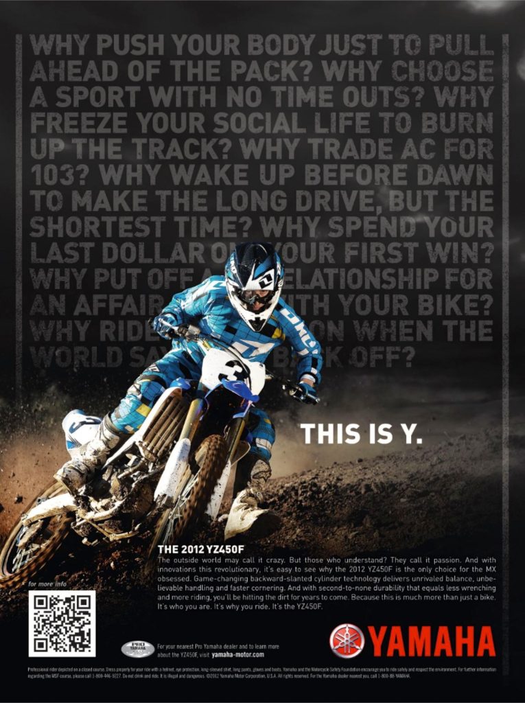 Blaze- This boring drivel is what passes for a motocross print ad these days. Considering Yamaha’s current PR nightmare with the backwards YZ450F, you would have thought they might put in a better effort. The overall design of the ad is visually uninspired and really makes no case why you should even stop to bother and read it. The “Y We Ride” slogan is at least an attempt at being clever, but in my opinion it comes off more like a home schooled kid’s poor grammar than a catchy tag line. This whole ad is flat, unremarkable and pretty much an embarrassment for a once proud brand.