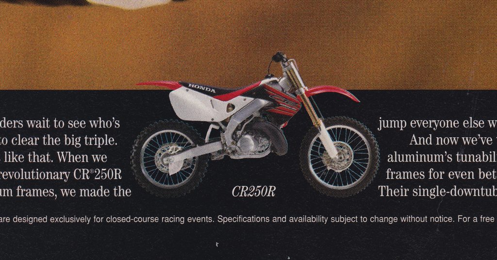 After the initial run of magazine spots, Honda rectified the oversight and replaced the ’99 with the ’00 model in later printings. It was an interesting example of a rare slip up by one of the most serious and successful brands in the sport.