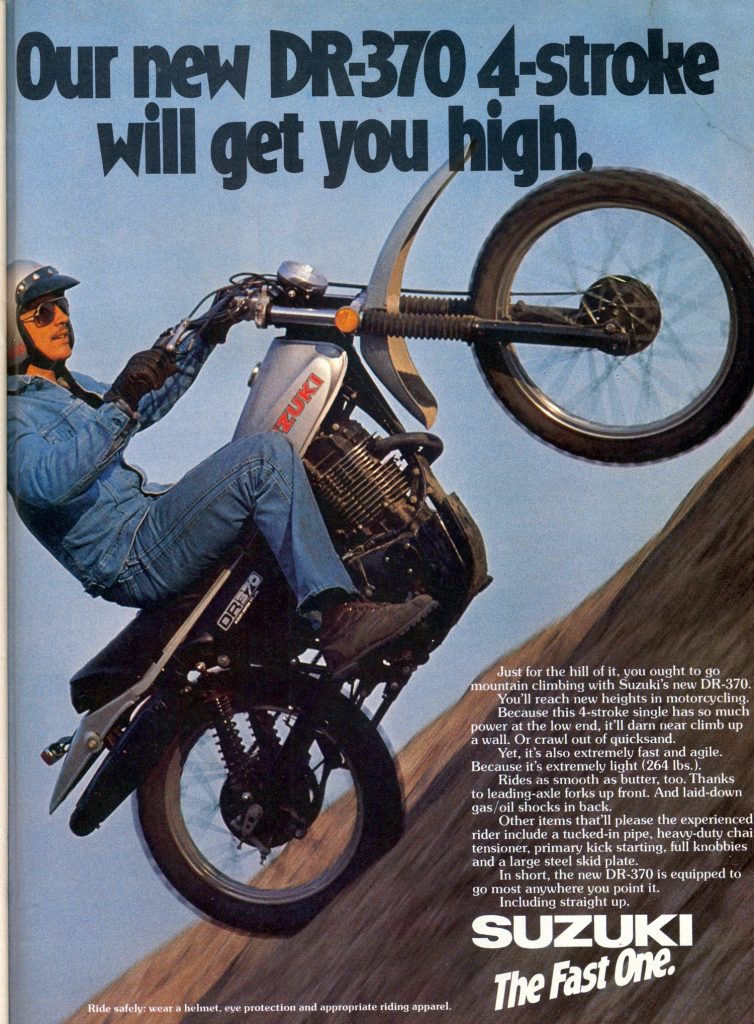 As for the rest of the ad, it certainly does not help that this is one of the lamest looking dirt bikes ever built. That bodywork is just terrible and the dude riding the bike looks like an extra from the set of some cheesy 70’s porn flick (it just wouldn’t be the 70’s without a set of aviators and a sweet creeper stash). I’ve never rode one of these machines, but one look and you just know it was god-awful. Can you imagine hitting a whoop at speed on this 300-pound lead sled? Maybe that’s why you needed the weed. Honestly, it is a wonder we made it out of the 70’s alive.Blaze- I know it was the 70’s and all, but really Suzuki? God knows I love a reefer reference as much as the next guy, but this just seems a bit much. Can you imagine if they tried something like this today? It would cause such a stink, Suzuki would have soccer moms with pitchforks and torches camped out in front of the corporate office in a matter of minutes (on the bright side, J-Law and the “get a Dell” dude would have a job). Maybe that is just my Nancy Reagan “just say no” brainwashing coming out though, so don’t mind me.