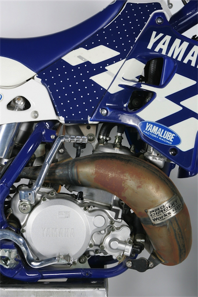 The Factory Yamaha’s in 1995 were a huge departure from the looks of the stock machines. Gone were the cartoon graphics and crazy lavender frame, to be replaced with a serious white and dark blue motif. In 1996, all of Yamaha’s production bikes would move to this new color scheme. |
