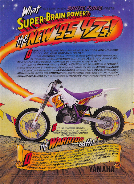 Not only were the graphics on the ’95 YZ cartoony, the ad campaign for it was just as over-the-top. Magazine inserts included a comic book with Yamaha engineers portrayed as super heroes. It may have been silly, but it was certainly memorable. |