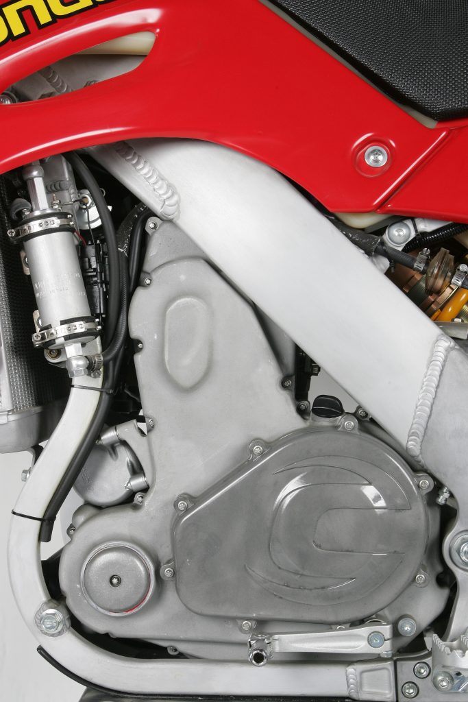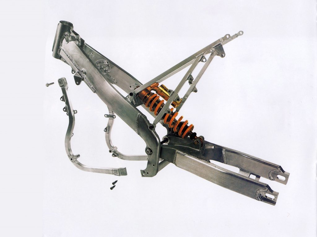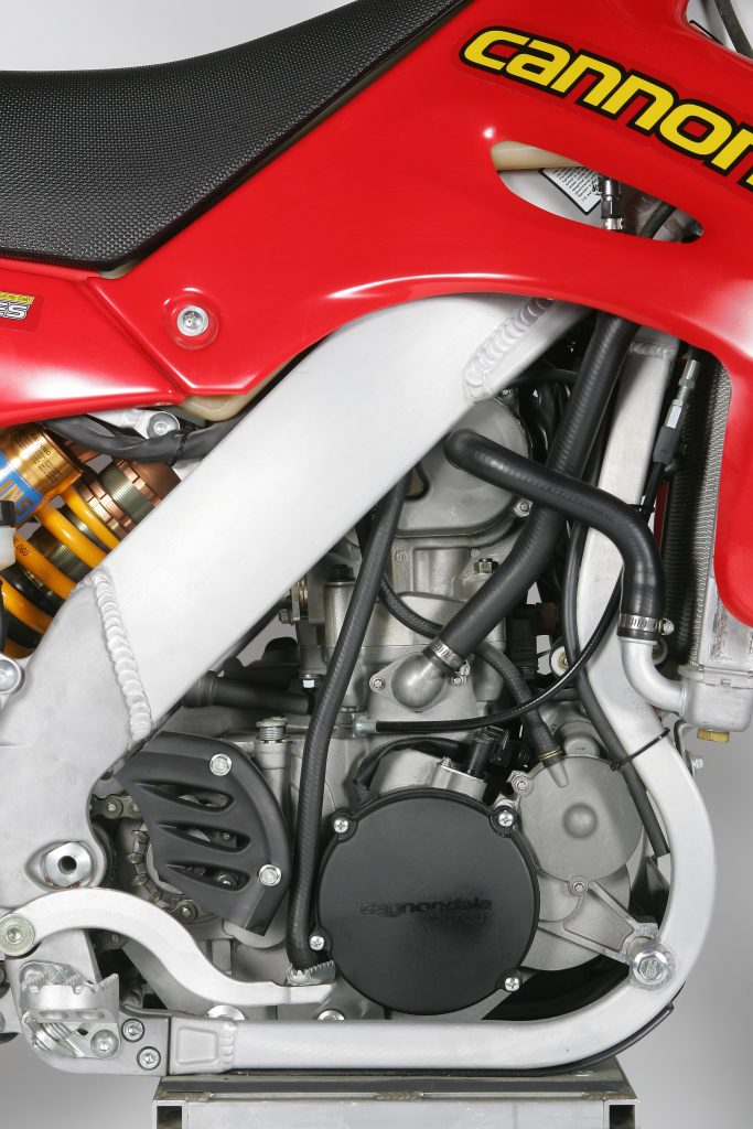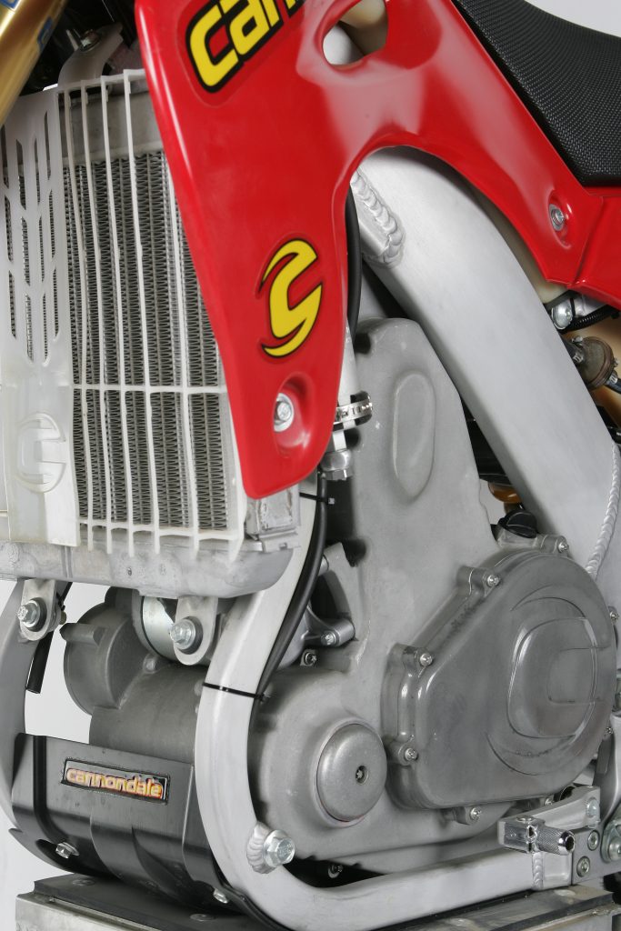 Initially, the most innovative component of the Cannondale was its frame. In 1998 when the bike was officially announced, only Honda was offering any sort of alloy chassis on an off-road machine. While similar in its perimeter configuration, the Cannondale version was unique with a set of front downtubes that could be removed to access the motor or be replaced if damaged. Aside from this and its no-link rear suspension, the Cannondale prototype seemed highly conventional. Early motor designs were reported to displace 408cc and the engine was largely based on existing Husqvarna and Husaberg designs. As the project moved forward, however, the Cannondale team started to break new ground in several areas.