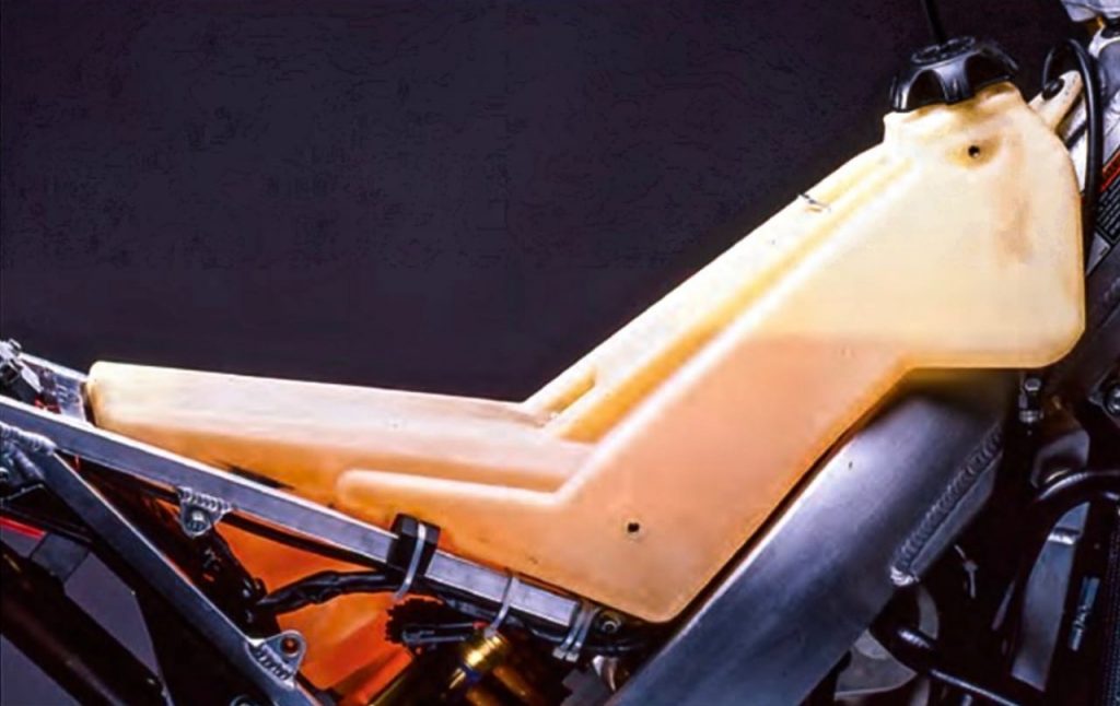 The Cannondale’s fuel tank carried 2.1 gallons and employed a rather unconventional design. Photo Credit: Motocross Action