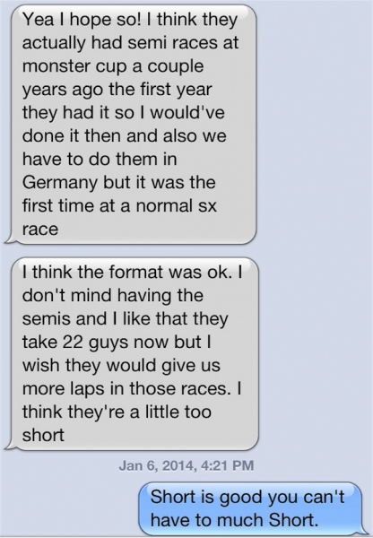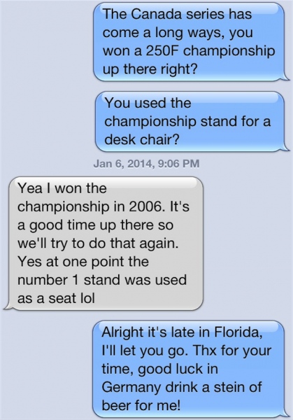 Almost making the main event after only a couple days on the bike is not a bad way to start the season after sitting out injured most of last year. I expect Chiz to continue improving I don’t think anyone questions he a main event guy and should be in that 10-15 range. With the help of Matthes I tracked down Chiz before he left for Germany to talk about what he does on a Monday night.
