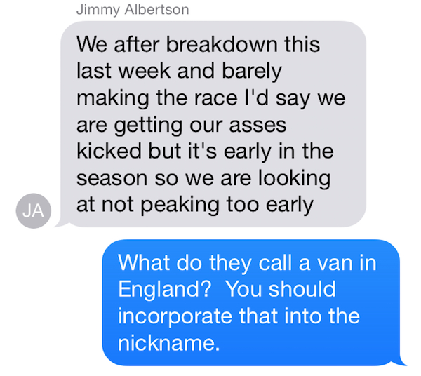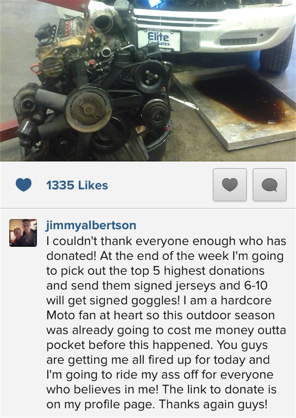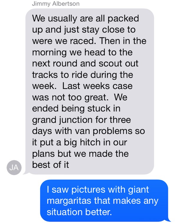 Top Jimmy Albertson is having a rough start to the season.  It was a game time decision whether or not the Crossland-Motosport semi truck was going to do the national circuit.  It ultimately came down to money, and I can’t imagine what it costs to have a semi truck go to all the rounds.  They parked the semi for the summer, and Jimmy and his brother/mechanic Gregg loaded up his recently purchased Sprinter van and hit the road.  I love the stories from the road because they are a lot like drinking stories.  In the moment, maybe not funny, but looking back you can’t not laugh about the adventures and memories.