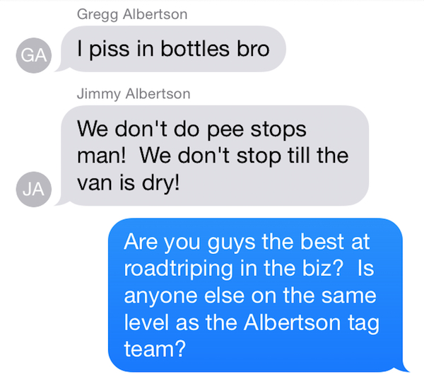 To summarize the outdoor season thus far for the Albertsons, Jimmy has struggled a bit and his Sprinter van blew an engine.  Everyone likes Top Jimmy and he could use a bit of help right now, so if you have the means, kick the guy a little coin over at www.jimmyalbertson.com.  (Just click the donate button).  Top Jimmy eluded me for some time he was the one elusive interview I could never finish, but just like my wife, he eventually gave in to my persistence and now he responds to me 50% of the time, 100% of the time.  Jimmy’s brother Gregg and I speak the universal language of beer, so we bonded immediately and a friendship has blossomed.  I got two Albertsons for the price of one this week, enjoy!