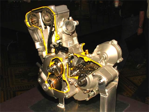 | When designing the RM-Z power plant, Suzuki looked at what the competition was doing and tried to come up with a better mousetrap. The semi-dry sump design Hamamatsu employed tried to combine the additional oil capacity of Yamaha’s dry sum system (1.5 liters), with the weight savings and lack of cross contamination offered by Honda’s sealed wet-sump design. |